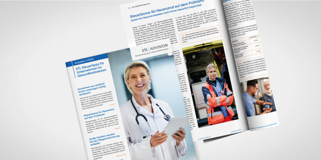 In der aktuellen Ausgabe wird u. a. die Versteuerung von Einnahmen aus wahlärztlichen Leistungen vorgestellt. Ein Beitrag beleuchtet die Entlastung von Großfamilien bei den Beiträgen zur Pflegversicherung. Zudem informiert die ETL ADVISION-Depesche II/2023 über die Auszahlungsmöglichkeit der Inflationsausgleichsprämie bis 2024 und klärt auf, inwiefern außergewöhnliche Belastungen Steuern mindern können.