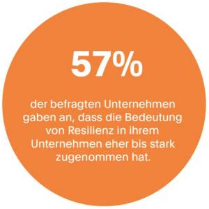 Kaum zu glauben: 57 Prozent der befragten Unternehmen finden, dass das Thema Resilienz in den vergangenen fünf Jahren eher oder stark an Bedeutung gewonnen hat. Jedoch: Weniger als die Hälfte der Befragten leiten daraus ab, mittelfristig eher oder sehr wahrscheinlich Maßnahmen zu ergreifen, die die Resilienz erhöhen.